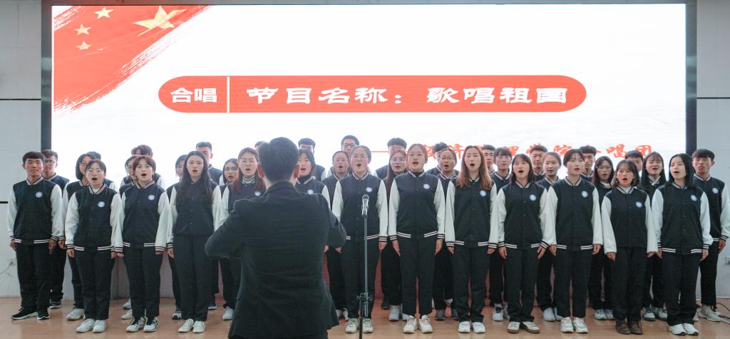 合唱团表演合唱《歌唱祖国》,歌声嘹亮,情感饱满,节目充分展示了学生们的爱国主义热情和昂扬的精神面貌,体现了91自拍
