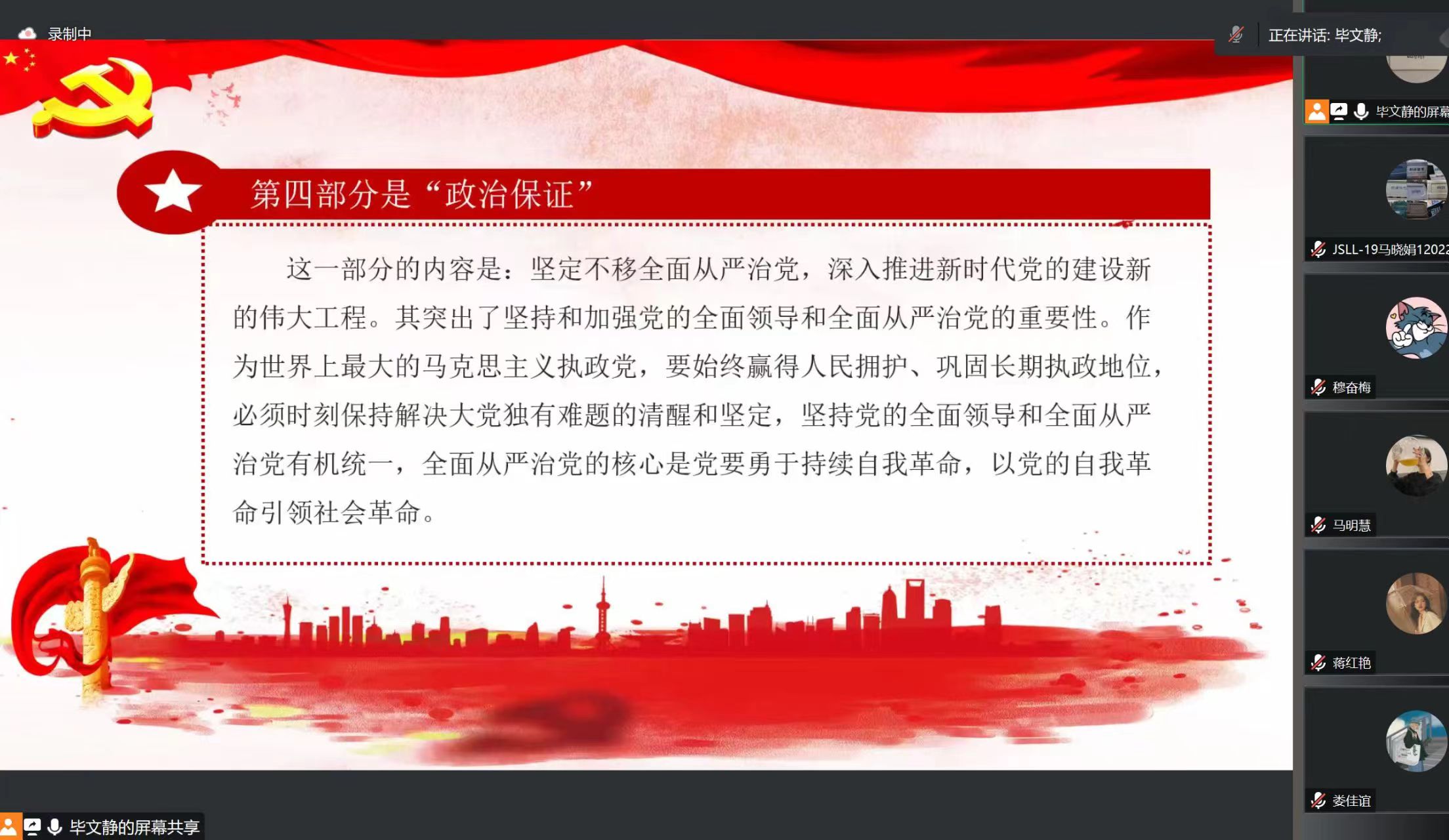 会议伊始,毕文静就二十大报告的总体框架结构进行讲解学习,分别讲解了二十大报告总论,及第二、三、四部分的内容及其独特地位和作用,并对第五部分的“动员令”作出详细地讲读。