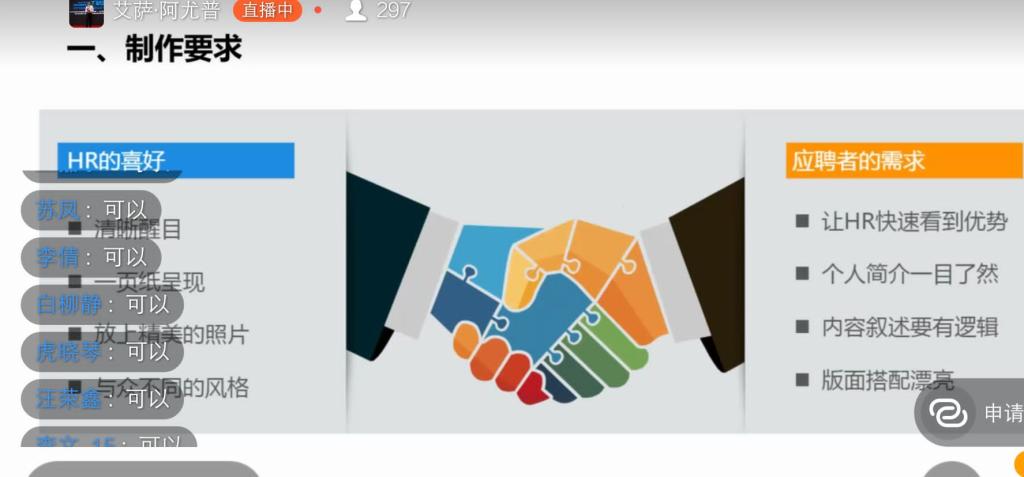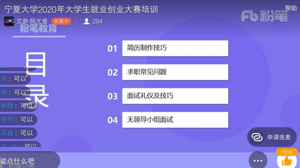2020年大学生就业创业大赛培训会。本次培训由粉笔教育公考培训师武乐义老师、学生工作办公室辅导员艾萨·阿尤普主讲,各学院学生参与线上学习。培训会由艾萨主持。