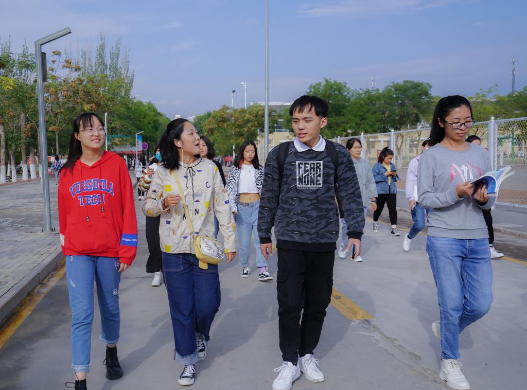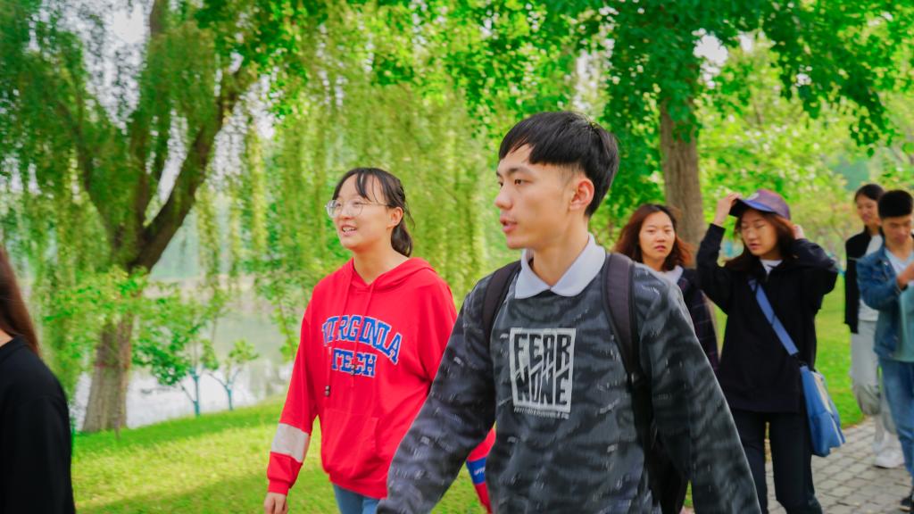 从贺兰山校区出发,一行人一路沿着农学院、音乐学院、美术学院走着,悠扬的练琴声传入耳中,路旁陈设着一系列创意作品,都显示出了校园的活力。绕过德勤楼,他们通过宁大桥进入怀远校区,环绕金波湖在健身跑道上徐徐漫步,晨风微起,碧波荡漾,金波亭周围荷叶铺陈,露珠晶莹剔透。清晨宁静的凌云广场也别有一番风采。同学们谈笑风生,赞叹于眼前的美景。经过图书馆,他们与背着书包匆匆而入的学子们不期而遇,也被91自拍