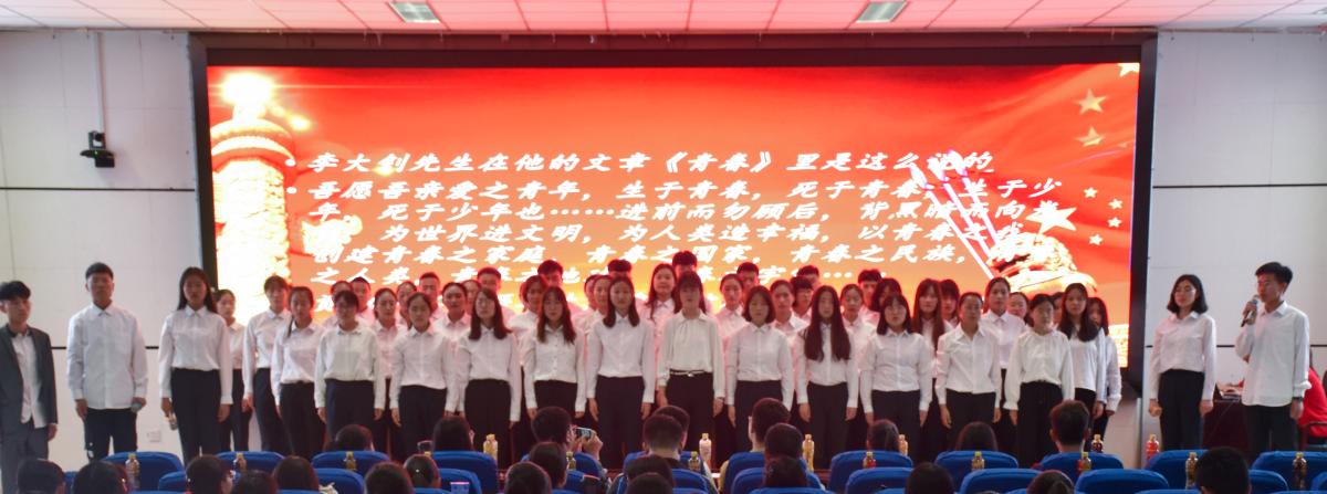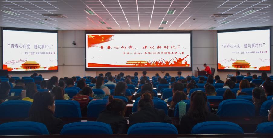 于贺兰山校区文荟楼东报告厅举行纪念“五四”运动一百周年展演比赛,活动由牟静雅、余杨主持,各机构委员、部长担任评委,18级全体同学到场参加。