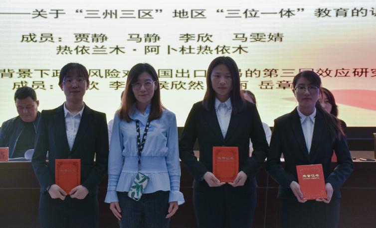 而后进行的是“挑战杯”颁奖仪式。2017级研究生宋欣代表获奖学生上台发言。她讲到,项目的成功不仅有赖于精确的选题、严谨的学术态度和密切的团队合作,老师的支持和指导更是不可或缺。王嘉豫宣布获奖名单后,获奖代表依次上台领奖,领导教师们分别与其合影留恋。