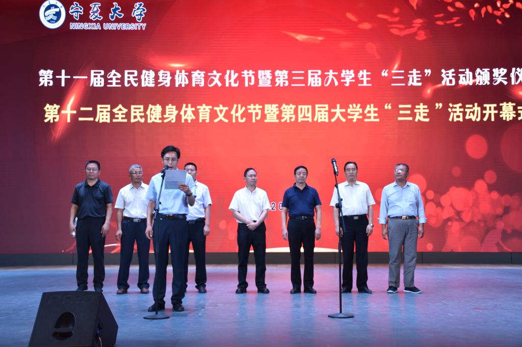 颁奖仪式结束后,由副校长谢应忠致开幕词并宣布第十二届全民健身体育文化节暨第四届大学生“三走”活动开幕。他总结了我校在上届体育文化节中取得的优异成绩并向精心组织和大力支持并积极参加本次体育文化节活动的广大师生表示了最诚挚的问候和最衷心的感谢。他提到,全体运动员都能以昂扬的斗志和顽强的精神,展示速度与力量、活力与激情的魅力,全体裁判员及工作人员都能以高度的责任心,展示公平与公正、专业与敬业的风采。