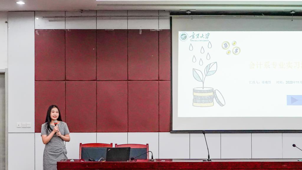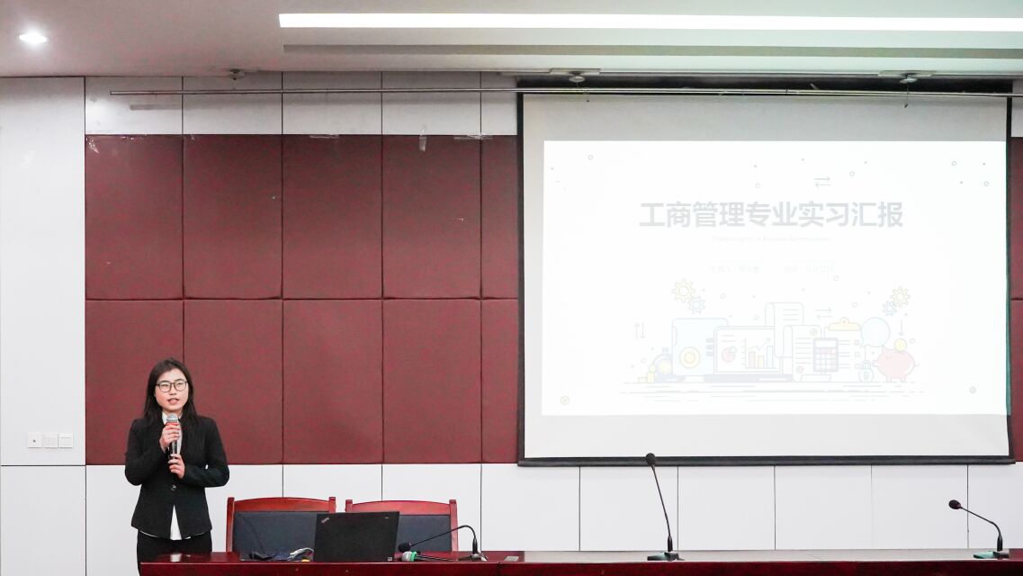 张彩彩宣读《专业实习汇报评奖细则》后,汇报会正式开始。信息管理与信息系统专业学生汇报了在宁夏聆音智能科技有限公司实习的情况,通过实习,同学们更加全面和清晰的认识了企业运营模式、业务流程、项目实施、管理理念、社会责任等方面的具体内容,结合自身专业特点,对标企业要求,本次实习经历为他们日后就业打下良好基础。会计学专业本科生蒋曦然通过结合自己的实习经历分享了会计电算化的创新发展以及复合型财会专业人才的发展方向。工商管理专业本科生杨百慧在汇报中讲到,基于工商管理专业的教学安排,并充分考虑疫情防控工作的相关要求,工商管理专业本学期的专业实习没有安排到企业顶岗进行而是学生以4到5人为一个小组,通过线上或线下调研的方式完成调研报告。实习主题调研围绕工商管理专业课程和研究方向,针对疫情下各类企业在经营管理中遇到的困境、问题,分析其原因并提出解决方案,以此为思路完成实习报告。物流管理专业本科生母小花讲解了本次实习共经历了实操演练、物流方案设计、物流数字化管理学习、立体货架储物学习、现代化信息管理学习、流通加工设备的参观和实习,并以专业素质、行业发展、社会使命感三个方面总结了本次实习收获。农林经济管理专业本科生倪雪作出了汇报,她说明了本次实习的背景和地点,并展示了农产品的高质量发展。倪雪总结到,在本次实习中同学们开拓了视野,树立了专业自信,领略了农业魅力。市场营销专业本科生李金凤在汇报中讲到,市场营销专业同学参加了宁夏数字经济高质量发展论坛,听特色,听发展,在实习过后收获了沉甸甸的营销案例,对于自己的未来也有了更为清晰的规划。电子商务专业学生和经济学专业学生也相继作出了汇报。