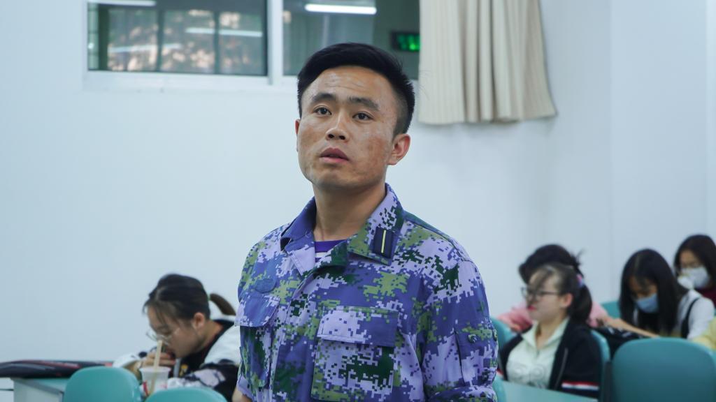 青春因磨砺而出彩,人生因奋斗而升华。张雅琳以一段视频向同学们讲述了自己的个人经历及感悟收获。她分享了初进新兵连时,军队的内务及严格的军规对她的挑战,战友的团结与鼓励让她坚定了初心与梦想,岗前集训感悟到的酸甜苦辣。关于应征入伍的流程和政策,张雅琳从应征入伍的年龄标准、身体条件、视力要求、兵役登记、应征报名及应征地选择等方面对大学生征兵入伍政策做了详细解读。提到优抚优待政策,她就尊崇优待、入伍发展、复学升学、经济补助、就业创业五个方面进行阐述,号召同学们携笔从戎,保卫国家。保卫国家终不悔,绿色军营献青春。黑学虎主要讲了征兵入伍的政治条件和有服兵役义务的公民的违法违规行为及其承担的法律责任追究。