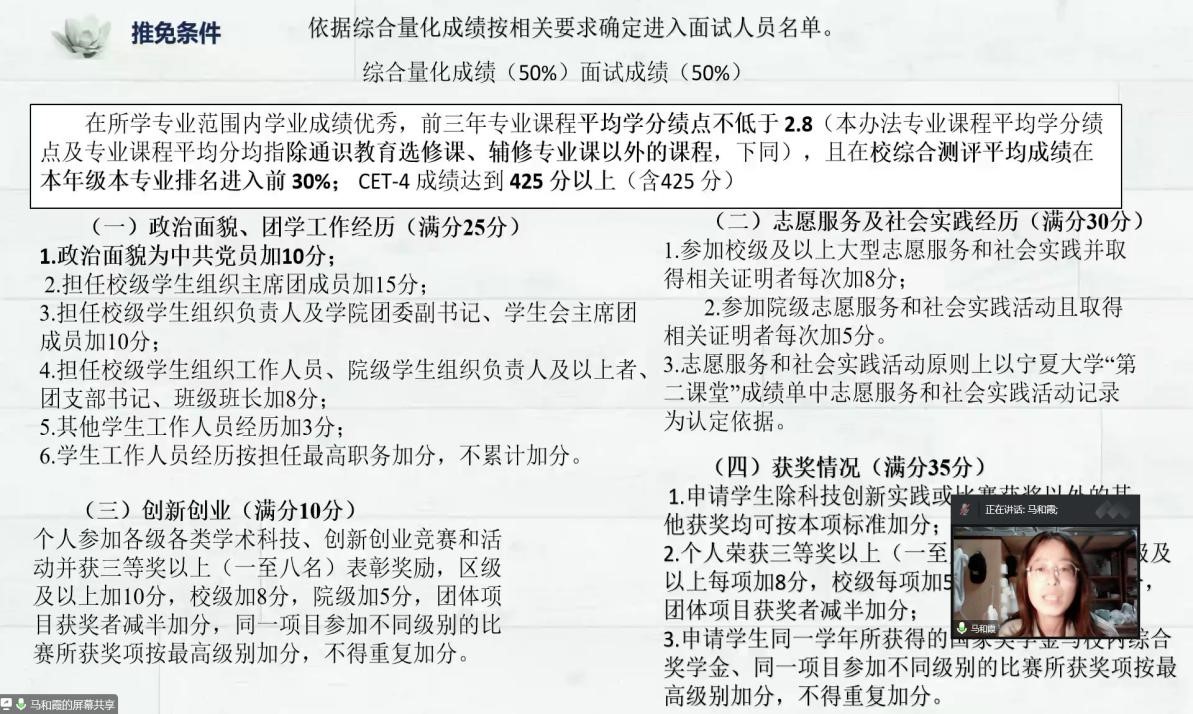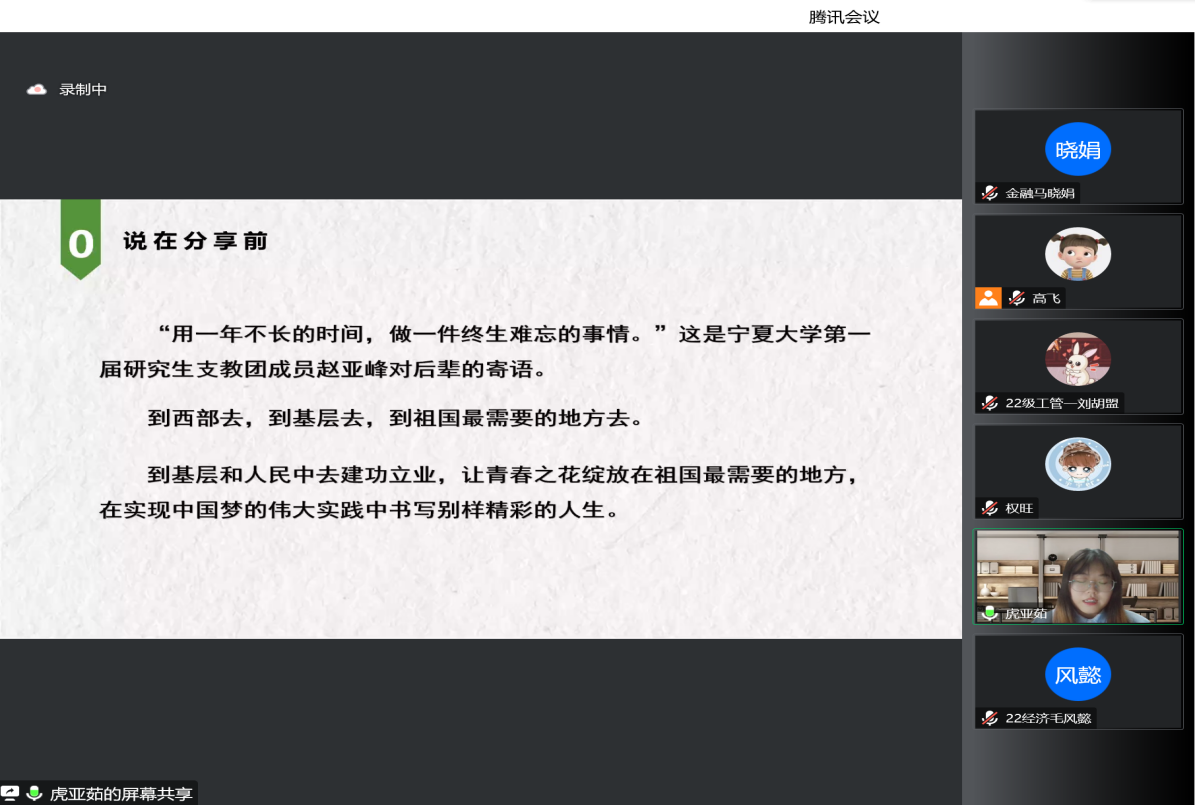 10月21日、22日晚,“塞上青春讲坛”系列活动之保研经验交流分享会于线上顺利召开。本次分享会由2019级本科生宋文静、梁振刚、权旺、虎亚茹、崔琳琳、孔令怡及2022级专业会计硕士马和霞分享,91自拍
