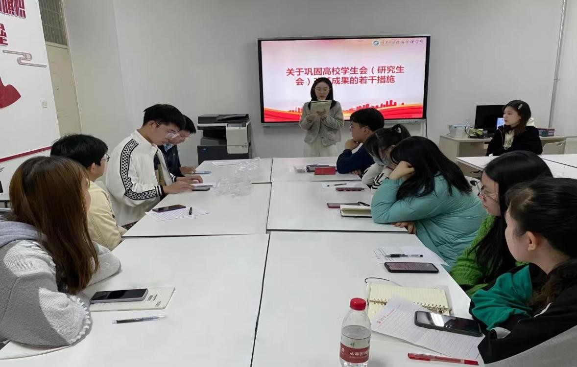 研究生会章程》等文件,并对研究生会各部门工作进行了总结。她强调作为青年学生干部,要时刻谨记自己肩负的责任与使命,紧密联系同学,提升研究生会的服务能力。