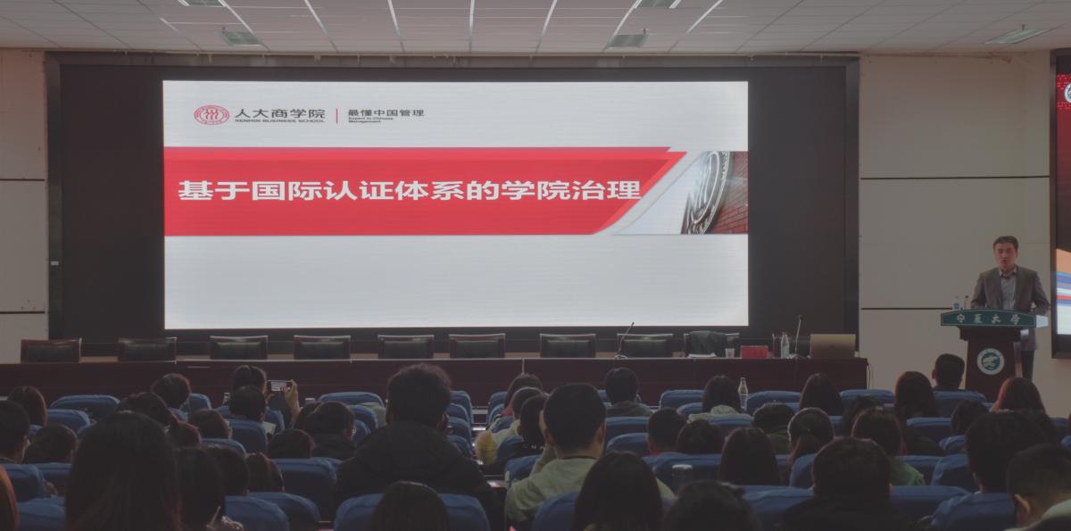 讲座过程中,毛基业从“基于国际认证体系的学院治理”与“商科教育的特征”两部分出发,分别从教师和学生的视角出发阐述了要建设一流院校,他们各自应当负担起怎样的责任。他从AACSB认证体系出发,提出要做好学院治理,首要任务是做好学院的战略管理,尤其应当重视学院使命、学院愿景的树立。其次,毛基业针对学院建设重要参与者——教师提出了一系列要求。他指出作为一名经济学院的老师,必须具有优越的学术资质、专业资质,并且要始终持有实施学习质量保障的目的和态度,积极推动组织变革,创新教学方式、升级教学管理体制,科学有效的培养学生,带领学生一同实现学院使命与愿景。毛基业更深一步指出,教师应从学院使命出发制定培养目标和目标学习成果,并在教学过程中不断吸纳相关中西优秀文化、不断改善培养计划,从而形成AOL闭环,持续推进学院教学质量改进,在场教师受益颇深。
