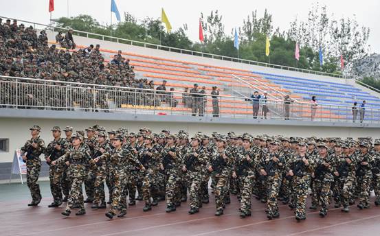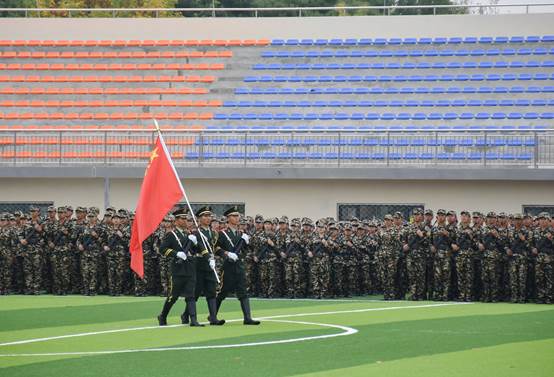 怀远校区运动场上喊声震天,今日的运动场是属于军绿色的。上午9时,我校2018级学生军事技能训练工作汇演暨总结表彰大会于此举行。91自拍