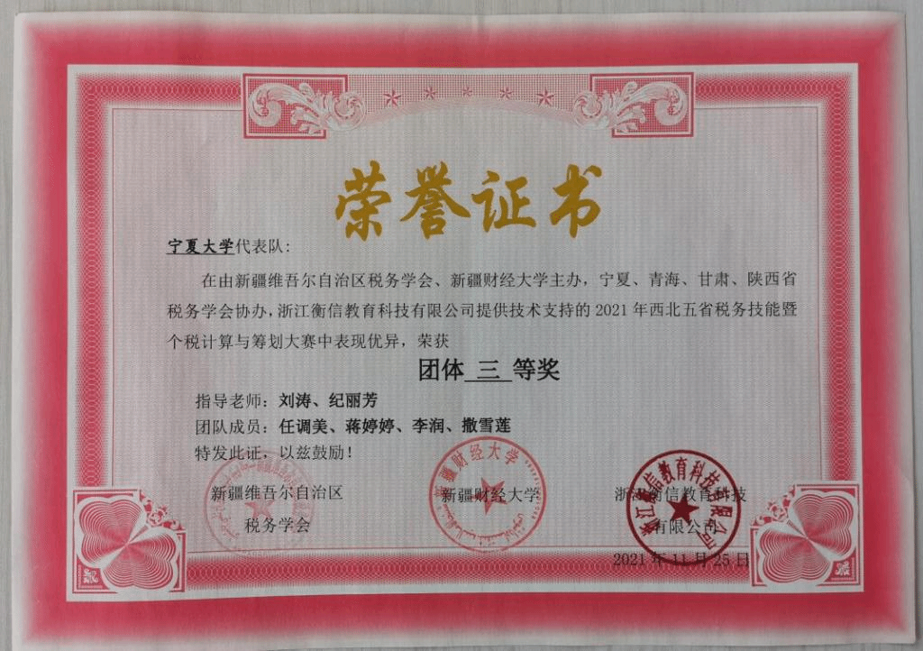 2021年11月14日,由新疆维吾尔自治区税务学会和新疆财经大学主办,宁夏、青海、甘肃、陕西等四省税务学会、高校共同协办,浙江衡信教育科技有限公司提供技术支持的2021年西北五省税务技能暨个税计算与筹划大赛在线上成功举办。共有来自五个省份的近30所院校,上百位选手共同参与了这场横跨大西北地区的财经赛事。