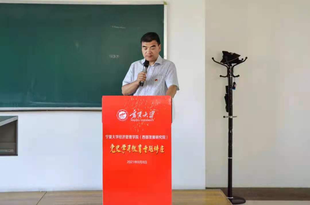 (西部发展研究院)党史学习教育专题讲座于贺兰山校区文荟楼230教室顺利开展。宁夏党校、马克思主义学院副院长刘雪梅教授结合中国经济发展形式和宁夏经济发展态势为师生带来精彩的讲座。讲座由学院党委委员、副院长仇娟东同志主持。