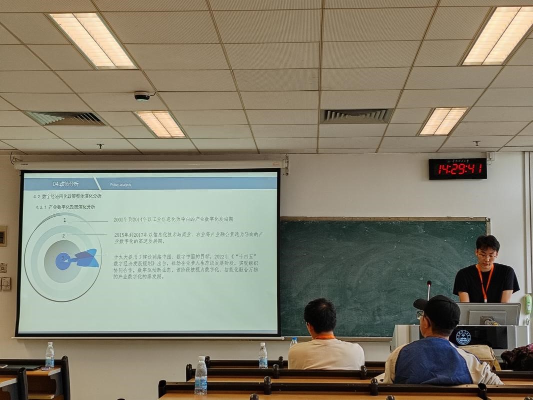 硕士研究生窦志胜汇报了论文《数字经济政策演化分析与量化评价研究》。论文通过多维视角对出台的148份数字经济政策进行四化政策演化梳理,在此基础上,构建政策一致性指数模型对十九大以来的42份数字经济相关政策进行量化评价研究。研究发现,数字经济政策处于可接受状态,数字化治理政策级别优越性最强、数据价值化最弱,各政策间级别优劣程度差异明显;其中,数字经济政策整体使用工具多样化水平较低、工具组合效率低、焦点带动性有待提升,政策支持强度与深度需要加强。