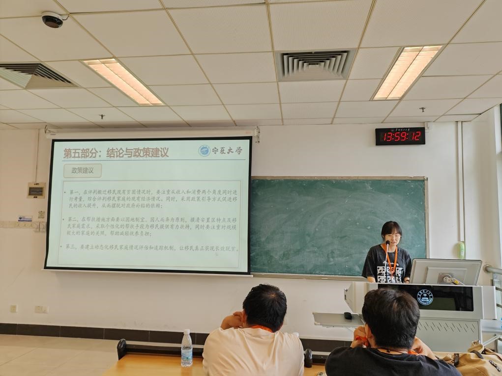 博士研究生罗媛月汇报了论文《搬迁能否一劳永逸——来自宁夏“十三五”搬迁移民的证据》。论文以巩固拓展脱贫攻坚成果同乡村振兴有效衔接为背景,应用宁夏“十三五”易地扶贫搬迁的实地调研数据,运用双差分倾向得分匹配方法,实证研究易地扶贫搬迁对移民长期减贫的效果。研究发现,易地扶贫搬迁显著降低了移民家庭的贫困脆弱性,促进了移民家庭的劳动力转移,促使移民家庭增加资产保有量,增强了移民脱贫的内生动力,劳务安置、集中安置以及搬迁时间更长的移民家庭长期减贫效果更好。