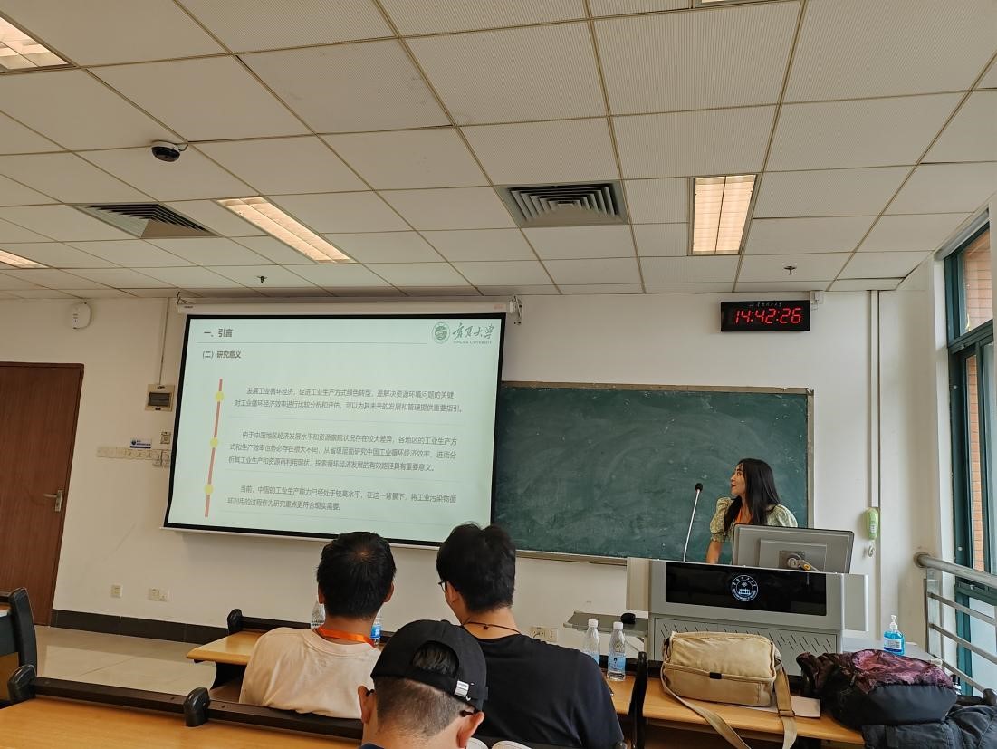 硕士研究生张淼汇报了论文《基于循环DEA的中国工业循环经济效率研究》。论文应用共同前沿下动态二阶段循环DEA模型,把工业生产全过程分为两个阶段:生产阶段和循环阶段,分别测度了中国省级工业循环经济的综合效率、阶段效率和指标效率。研究发现,综合效率存在较大的改善空间且具有明显的地区差异性,循环阶段效率值低是造成综合效率值低的主要原因。从指标上看,中间变量的指标效率整体上低于投入变量和产出变量的指标效率。发展工业循环经济,提高资源利用效率和再生资源利用水平的空间巨大。