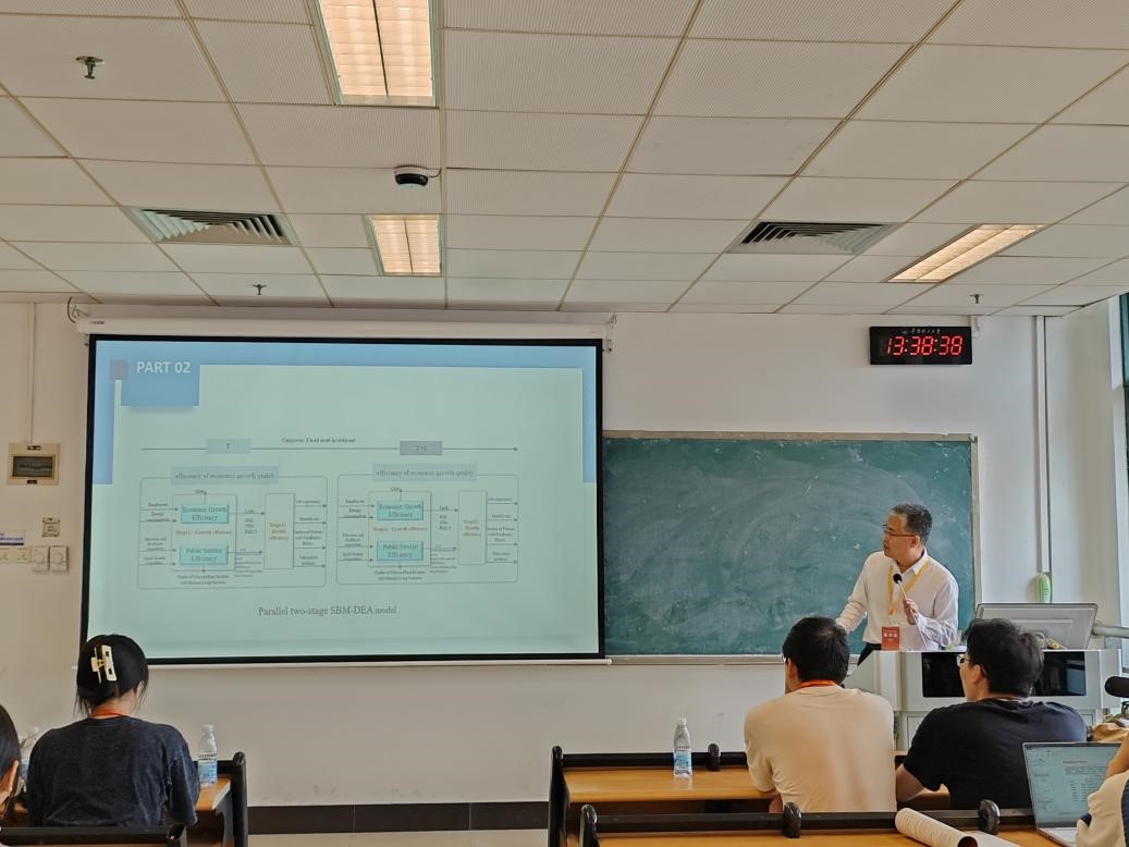 杨国涛教授汇报了论文《Efficiency Study on the Quality of China's Economic Growth Based on Parallel Two-Stage DEA》。论文测算了中国经济增长质量效率,采用考虑非期望产出的动态二阶段并行SBM模型构建了增长效率和健康效率的两阶段分析框架,对2017-2021年中国30个省份的数据进行了处理。研究结果表明,大部分省份需要提高经济增长质量的效率,增长效率的提高空间比健康效率更大。此外,并行阶段的经济增长效率明显高于公共服务效率。