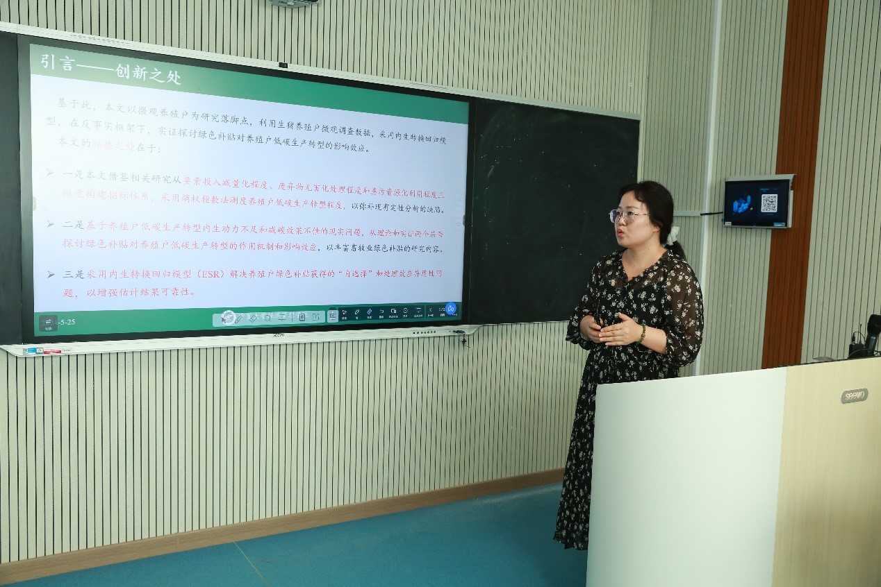 最后进行报告的是谭永风,其报告题目为《绿色补贴能否促进养殖户低碳生产转型》。谭永风利用四川和山东两省498份生猪养殖户微观调查数据,通过内生转换模型,得出绿色补贴获得能够促进养殖户低碳生产转型,绿色补贴对风险偏好程度较高、养殖规模较大以及受环境规制水平约束较强的养殖户,其低碳生产转型的促进效果更为明显等结论。点评嘉宾给出了各自的指导意见。陈永清对论文格式提出了修改意见,指出标题不应该是问句,且论文内容也应加以修正,需要更详细的调研数据。杨光首先对作者能够完整使用内生转换模型表示赞许,但建模所用数据过少,使得结论不具代表性,接着杨光举了猪肉价格的例子,指出数据少时要充分证明少量数据所得结果可以代表大量数据所得结果。邹红指出本文使用二值变量度量绿色补贴没有变异度,且该二值变量本身存在很强的内生性,建议再做一轮更为细致的调研。叶初升认为这篇论文的结论在意料之中,并没有创新,可以将山东、四川两省的数据纳入研究,进行更深入地分析,寻找其中差异。