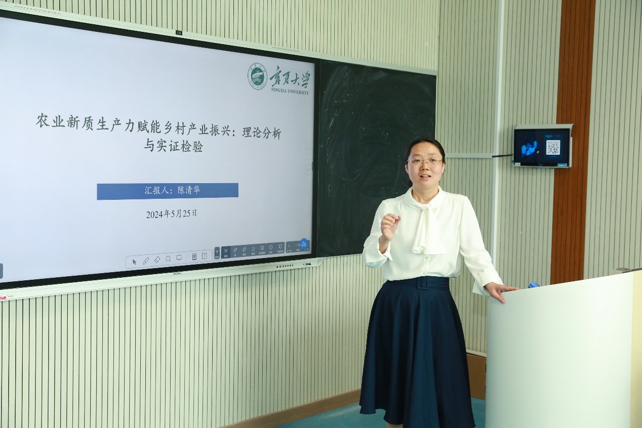 接着进行报告的是陈清华,其报告题目为《农业新质生产力赋能乡村产业振兴:理论分析与实证检验》,陈清华首先从农村经济的现状入手,提出当下存在的问题,点明论文主题“农村新质生产力”。之后,陈清华运用2011-2021年全国30个省级面板数据对农业新质生产力发展水平及基尼系数进行测算,采用一阶差分与二阶差分的方法进行建模运算,结论为:全国农业新质生产力水平呈上升趋势,且呈现东部>中部>东北部>西部地区的特征,农业新质生产力显著促进了乡村产业振兴,且农业新质生产力对邻近省份乡村产业振兴存在空间溢出效应。陈永清建议使用县级数据进行研究,从而使得更加细致的结果。杨光发现论文实证结果可以进行进一步探索,即在控制固定效应后