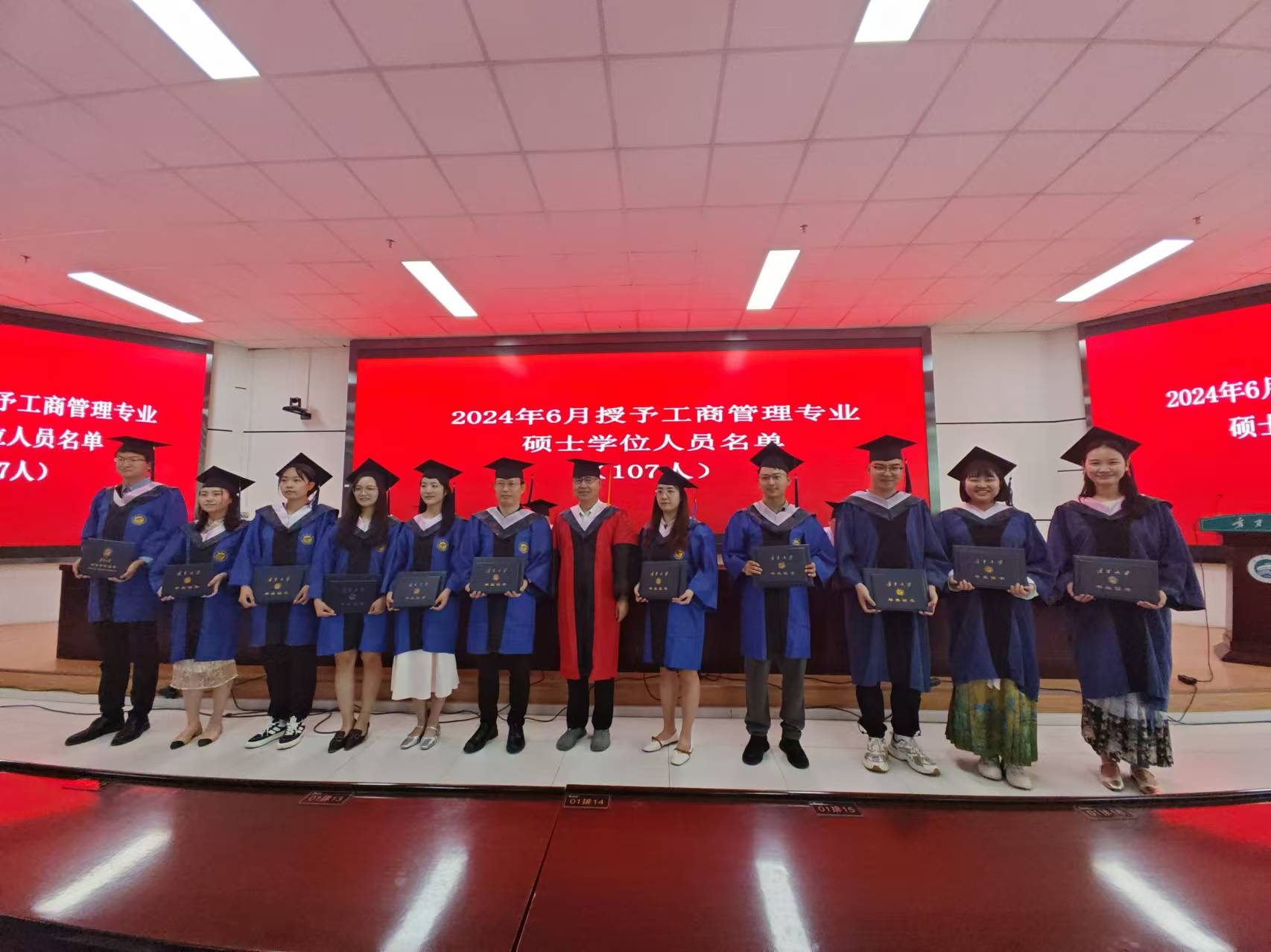 2024届工商管理专业硕士学位授予决定、2024届MBA优秀毕业生表彰决定。学院党总支书记赵军、院长杨国涛教授为获奖毕业生代表颁发证书。