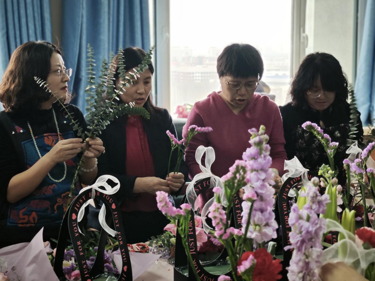 学院特意邀请专业花艺师,从花卉品种、色彩搭配、造型技巧等方面进行讲解,并现场演示插花步骤。女教职工们兴致盎然,纷纷拿起剪刀修剪枝叶,将郁金香、玫瑰、康乃馨、紫罗兰、香水百合等花材巧妙组合,精心打造独具匠心的花艺作品。