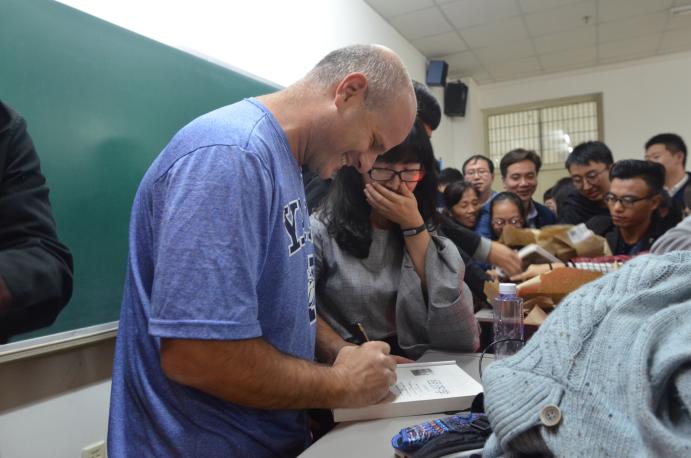 会后,卡尔兰教授签名赠书,将自己的新书赠予参会老师,并与大家合影留念。