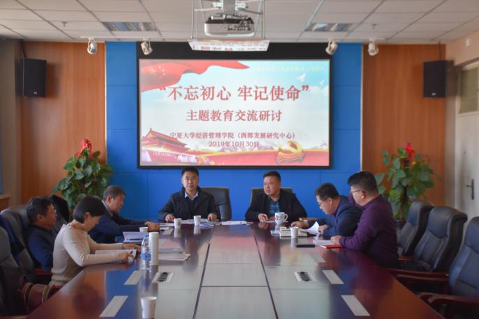 于贺兰山校区文荟楼召开“不忘初心,牢记使命”主题交流研讨会。院党委书记张桓,院长杨国涛,西部发展研究中心主任黄立军,院党委副书记程胜利,副院长冯蛟,西部发展研究中心副主任王国庆、董小焕参加会议。会议由张桓主持。