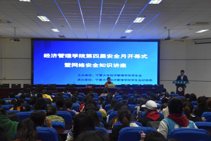 第四届安全月活动正式开始,紧接着余洁进行了“网络文明守纪与安全教育”的主题讲座。余洁从网络与大学生活、网络安全、网络文明守纪,安全教育四个方面详细剖析了网络的利弊,引用生动具体的案例讲述种种网络安全陷阱。