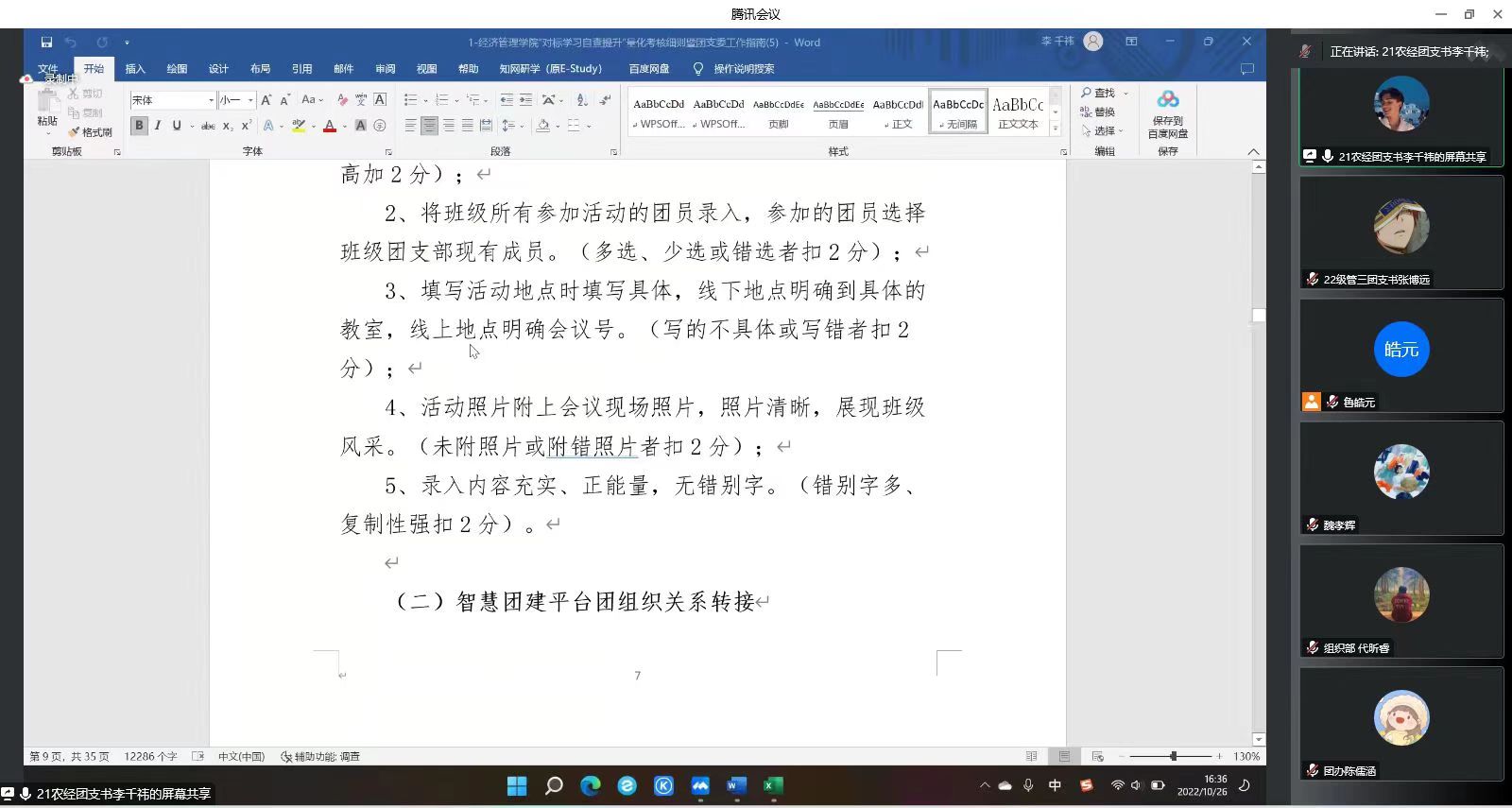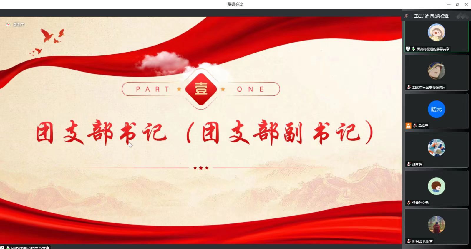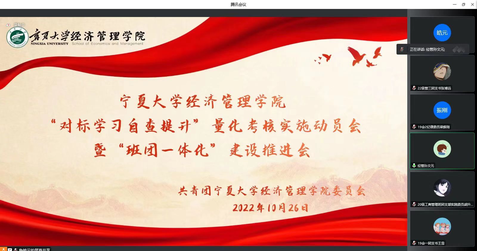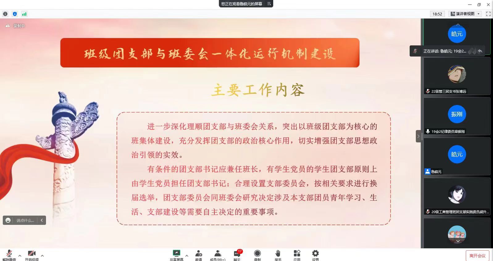 10月26日下午,91自拍 “对标学习自查提升”量化考核实施动员会暨“班团一体化”建设推进会在线上顺利举行。91自拍 团委副书记孙文元,团委组织部、智课服务部、团委办公室全体成员及全体团支部支委参加会议。会议由鲁皓元主持。