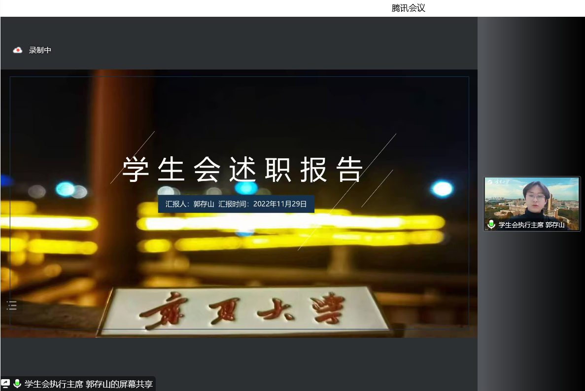郭存山代表学生会做述职报告,他表示学生会就加强思想政治引领,全面推进组织建设、开展多元优质活动,丰富了同学们的课余时间,充实了大学生活、让同学们在学习中不断进步,在工作中不断提升,并就学生会工作的不足提出修改建议。