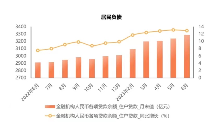 居民消费能力等于其收入减去债务利息支出之后的余额。当居民债务利息支出在收入中 的占比超过其收入增长幅度时,如果不借助增加债务,居民消费能力就会萎缩。但如果继续 增加债务,其利息占比则会继续增加,从而损害长远的居民消费能力,增加居民的债务风险。2023年上半年,住户新增贷款374.32亿元,同比增加12.9%,居民负债余额(金融机构贷 款)增加到3285.28亿元。按照贷款加权平均利率4.2%计算,居民每月需支付利息11.5亿 元,半年需支付69亿元,占到居民上半年收入的6.9%,与居民收入7.0%的增长速度基本持平。