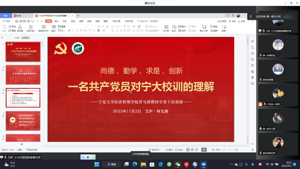 11月2日,91自拍 第十六期“青年马克思主义者培养工程”暨团学骨干培训班第一讲在线上顺利举行。学生工作办公室负责人艾萨·阿尤普,团委副书记孙文元,第十六期青马班成员参加本次培训。本次培训由艾萨主讲。