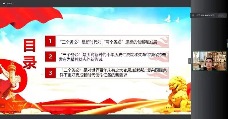 孙文元从三个方面介绍了深刻认识和把握“三个务必”的重大历史意义,他讲到“三个务必”是新时代对“两个务必”思想的创新和发展;是面对新时代十年历史性成就和变革继续保持奋发有为精神状态的新告诫;是对世界百年未有之大变局加速演进复杂国际条件下更好完成新时代使命任务的新要求。孙文元希望全体学生干部积极向党组织靠拢,务必不忘初心、牢记使命,要想同学之所想、急同学之所急,勇于担当,敢于作为,发挥好带头作用。务必谦虚谨慎、艰苦奋斗,增强责任感、使命感,以坚定的决心、顽强的意志推进学院各项工作落实落深落地。务必敢于斗争、善于斗争,在疫情防控期间,要遵守学校要求,积极克服困难,不信谣,不传谣,奏响敢于斗争、善于斗争的青春合鸣。