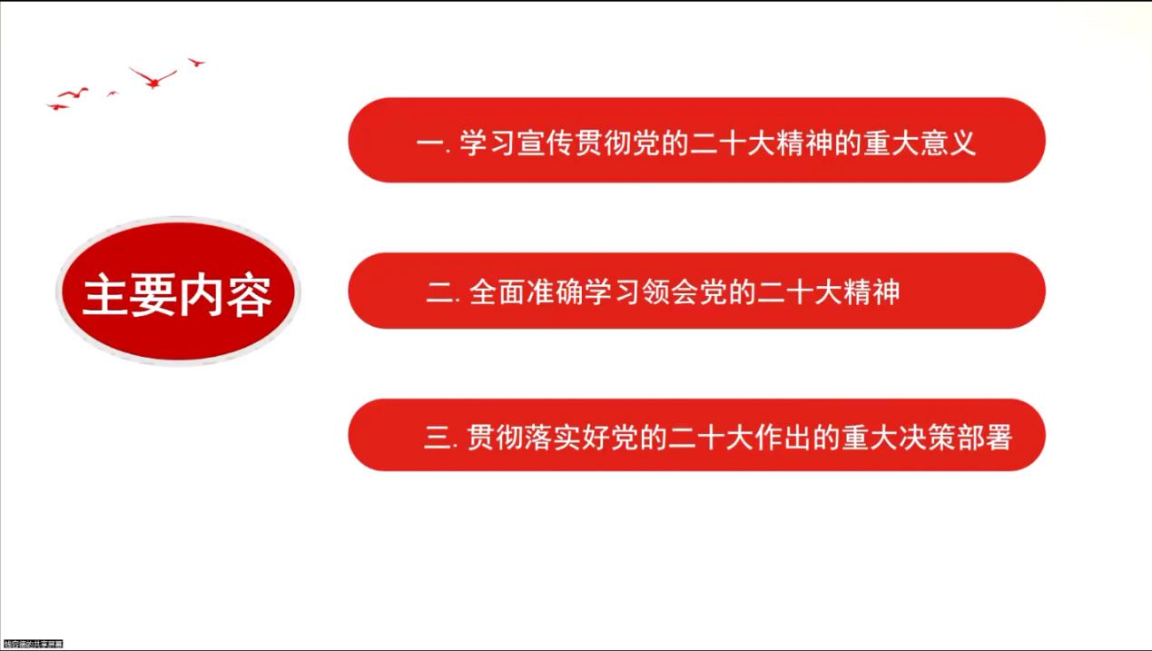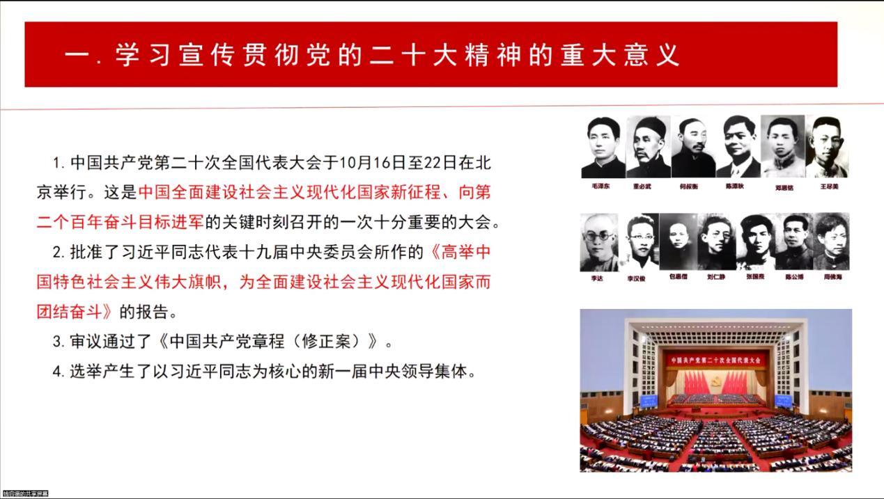 钱容德老师从学习宣传贯彻党的二十大精神的重大意义,全面准确学习领会党的二十大精神,贯彻落实好党的二十大作出的重大决策部署三方面进行分享。他号召广大师生要做好自己的本职工作,坚定不移听党话、跟党走,怀抱梦想、脚踏实地、敢想敢为、善作善成。