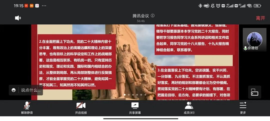 党员代表张澳群表示作为新时代的学生党员,我们要守纪律、讲规矩,自觉做政治上的“明白人”,不放松理论学习,不放松自身修养和素质的提升,不放松工作生活中的小节问题,自觉加强学习,筑牢理想信念;张淼同志通过学习认识到作风建设永远在路上,作为党员应当严于律己,行为要清正,切实增强自律观念,自觉抵制不良风气的侵蚀,高标准严要求,主动接受各位党员同志的监督;朱东升同志表示从反对形式主义和官僚主义来看,应当重点关注以下两个方面:一是要紧盯形式主义、官僚主义新动向新表现,充分认识形式主义、官僚主义的多样性和变异性,摸清其在不同时期、不同地区、不同部门的不同表现;二是要拿出真招实招,切实加强监督管理,抓出实效。